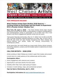 New York, NY. April 1, 2026 — The West Chelsea Artists Open Studios announces its 2026 Call for Artists, inviting painters, sculptors, photographers, and multidisciplinary artists to participate in one of New York City’s most dynamic and direct engagements between artists and the public.